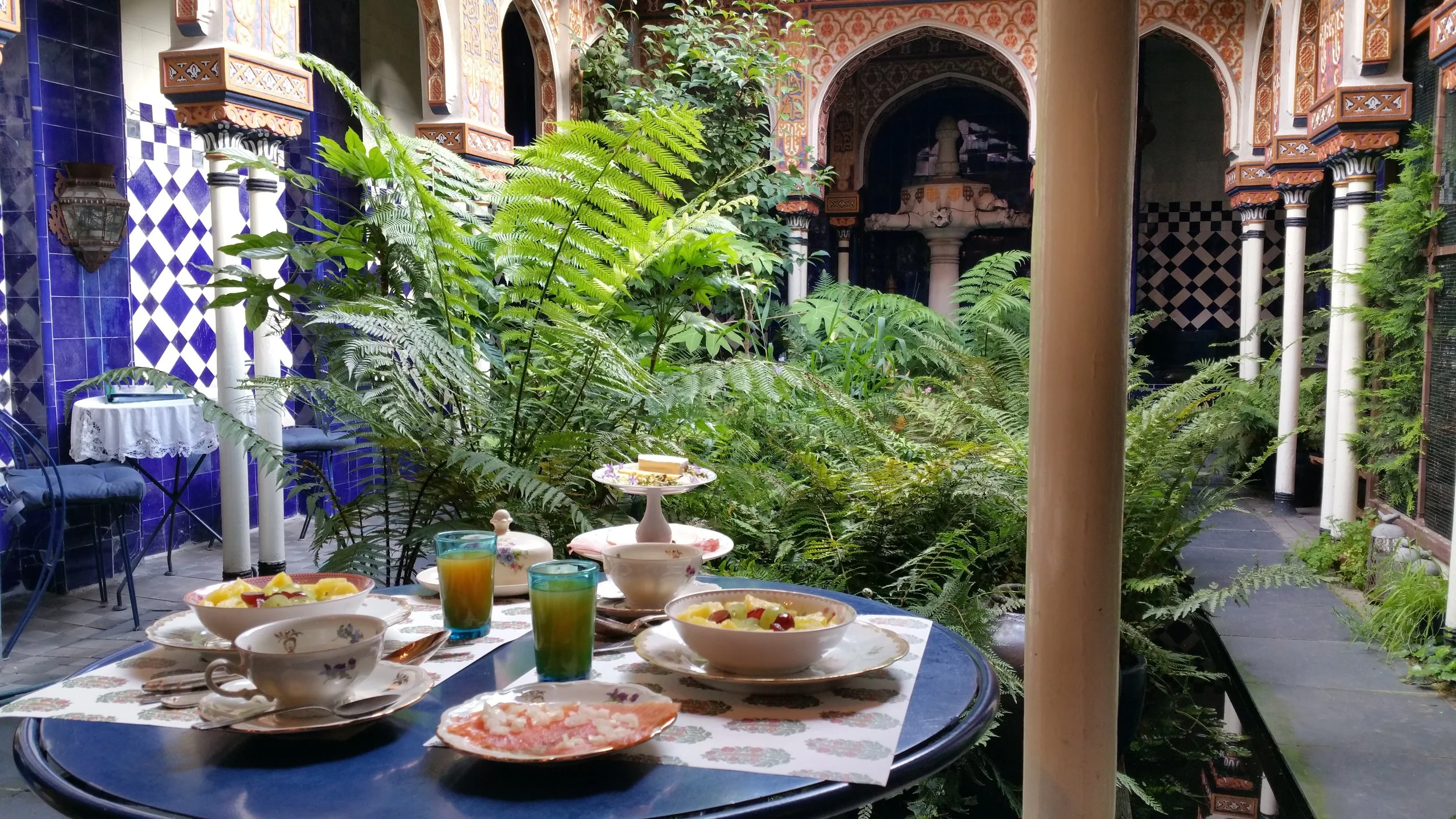 The winter garden is of a hybrid design. The doorway is in Alhmohad style and reminiscent of Granada, the walls are tiled with mirrors and colored glass stones originating from Chari Bazaar in Delhi, and there are mosaics from Tunisia and from Damascus. Please keep the door closed. To avoid a dangerous draught from passing through the house, the door giving out on the walled garden should be kept closed, even in summer.