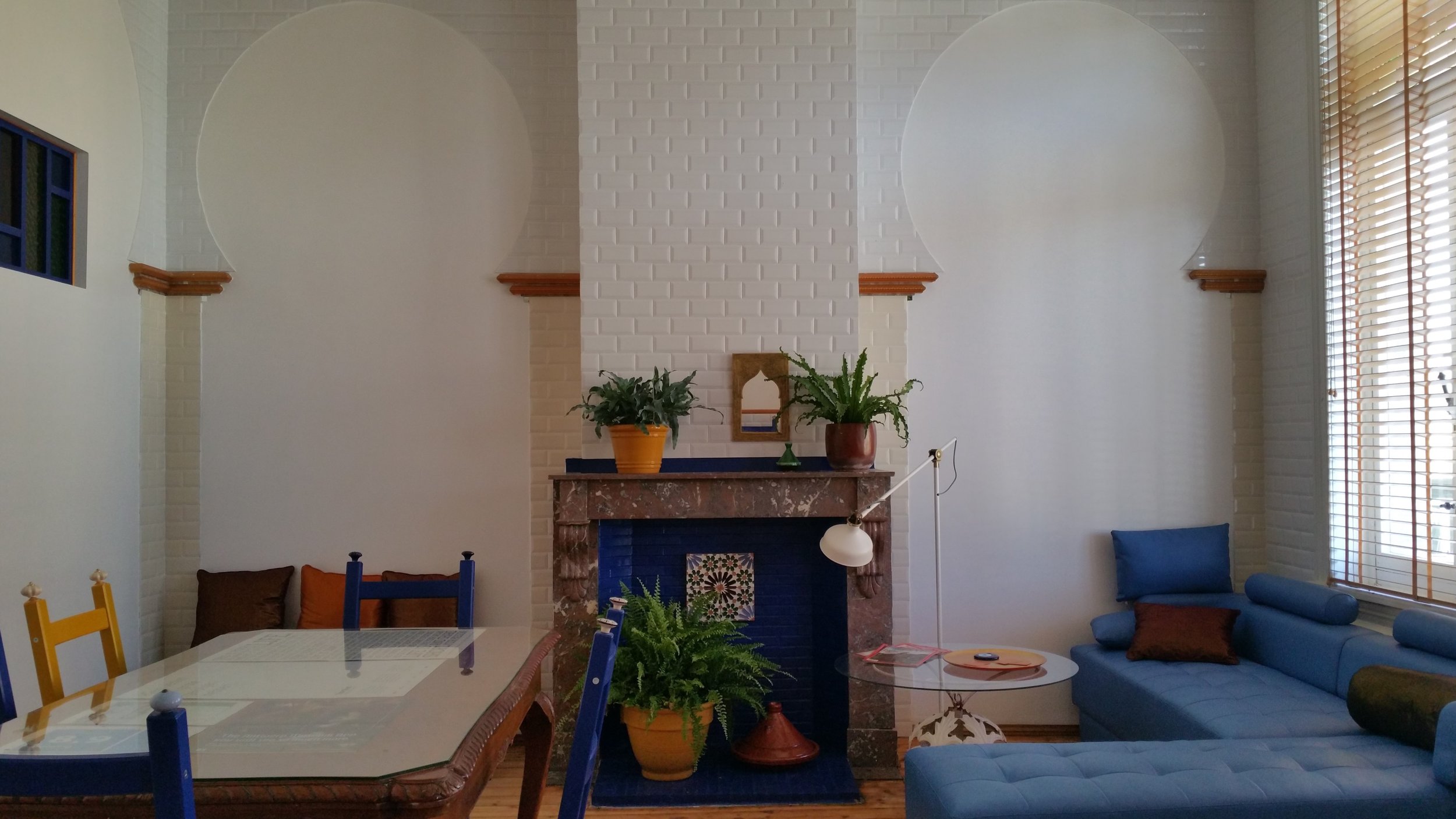 The dining room is the second space in the Granada Alhambra en-suite series of spaces on the ground floor. Unlike the center room, the street-side Alhambra room is private and is not accessible. The dining room is separated from the kitchen by a sliding door. It can be used as a co-working area and as a space to eat and sit.
